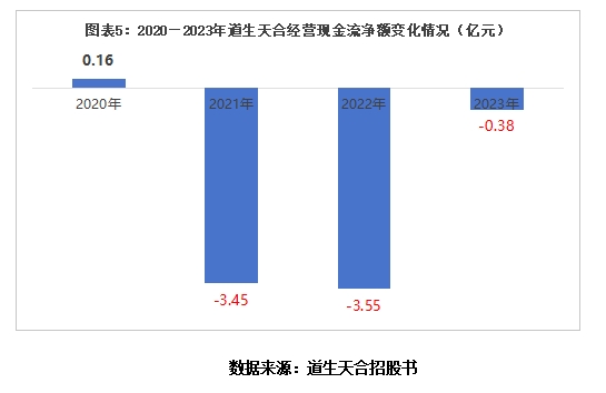 首版和最新版招股书显示,2020—2023年,道生天合的经营现金流量净额分别为1561.28万元、-3.45亿元、-3.55亿元、-3773.23万元,其中,2021—2023年经营现金流量净额连续三年为负。