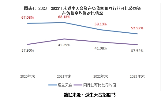 招股书显示,2020—2023年末,道生天合的资产负债率分别为67.08%、68.13%、58.13%、52.52%,同行业可比公司的资产负债率均值分别为37.90%、45.39%、41.08%、37.52%。
