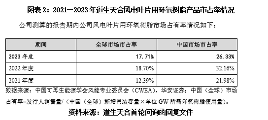据首轮问询函回复文件,据道生天合测算,2021—2023年,该公司的风电叶片用环氧树脂全球市占率分别为12.39%、18.70%、17.71%。