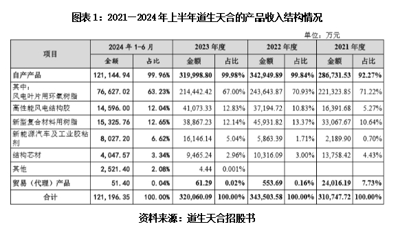 招股书显示,根据中国石油和化学工业联合会环氧树脂及应用专业委员会出具的说明函,2022—2023年,道生天合“风电叶片用环氧树脂系列”产品销量连续两年位居全球第一。