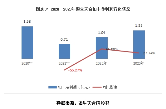 首版和最新版招股书显示,2020—2023年,道生天合的营业收入分别为33.32亿元、31.27亿元、34.36亿元、32.02亿元,年复合增长率为-1.32%,其中2021年和2023年营业收入均同比下滑;同期扣非净利润分别为1.58亿元、0.71亿元、1.04亿元、1.33亿元,年复合增长率为-5.68%,其中2021年扣非净利润同比下滑55.27%。